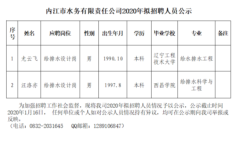 內江市水務有限責任公司2020年擬招聘人員公示
