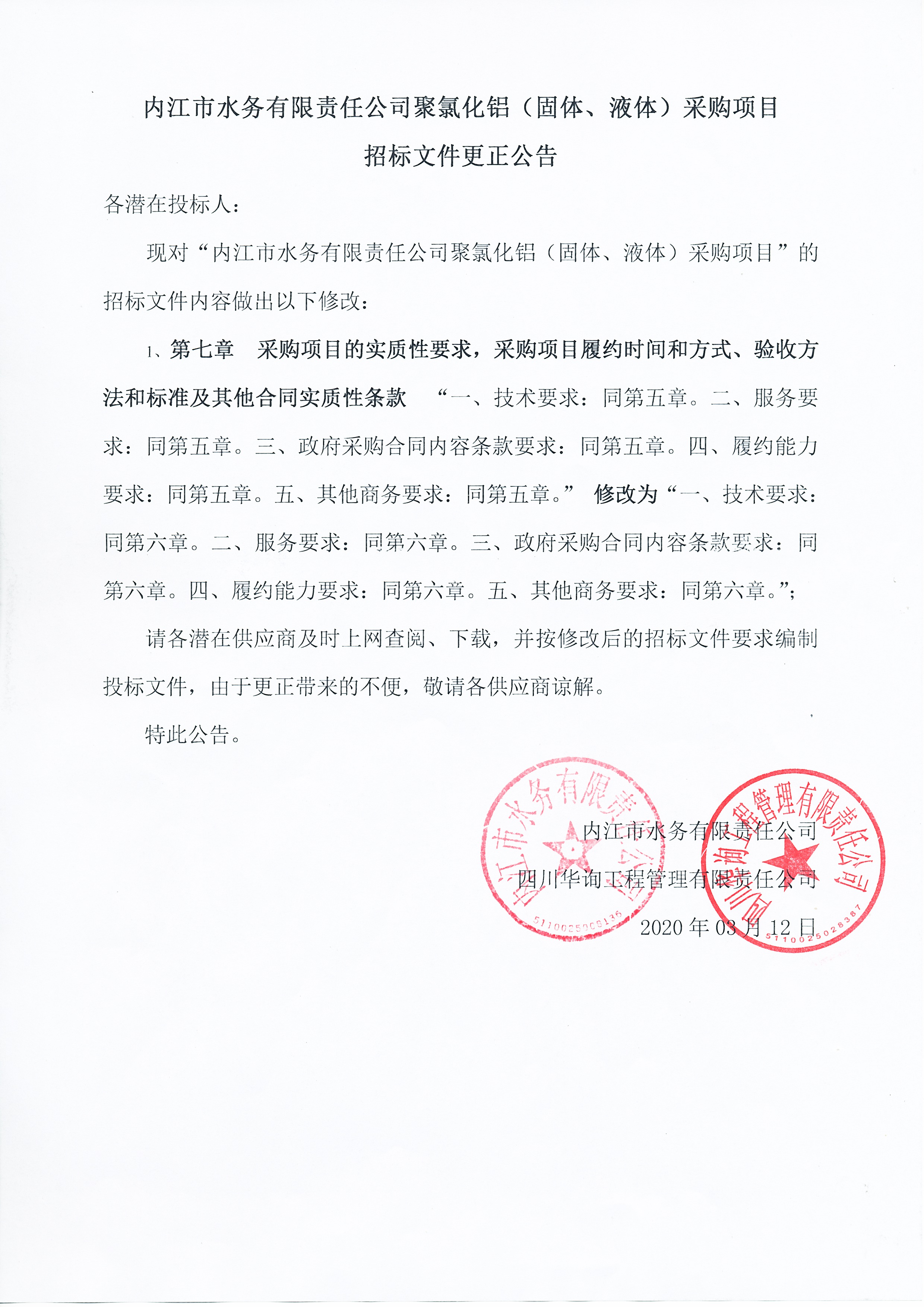內江市水務有限責任公司聚氯化鋁(固體、液體)采購項目招標文件更正公告