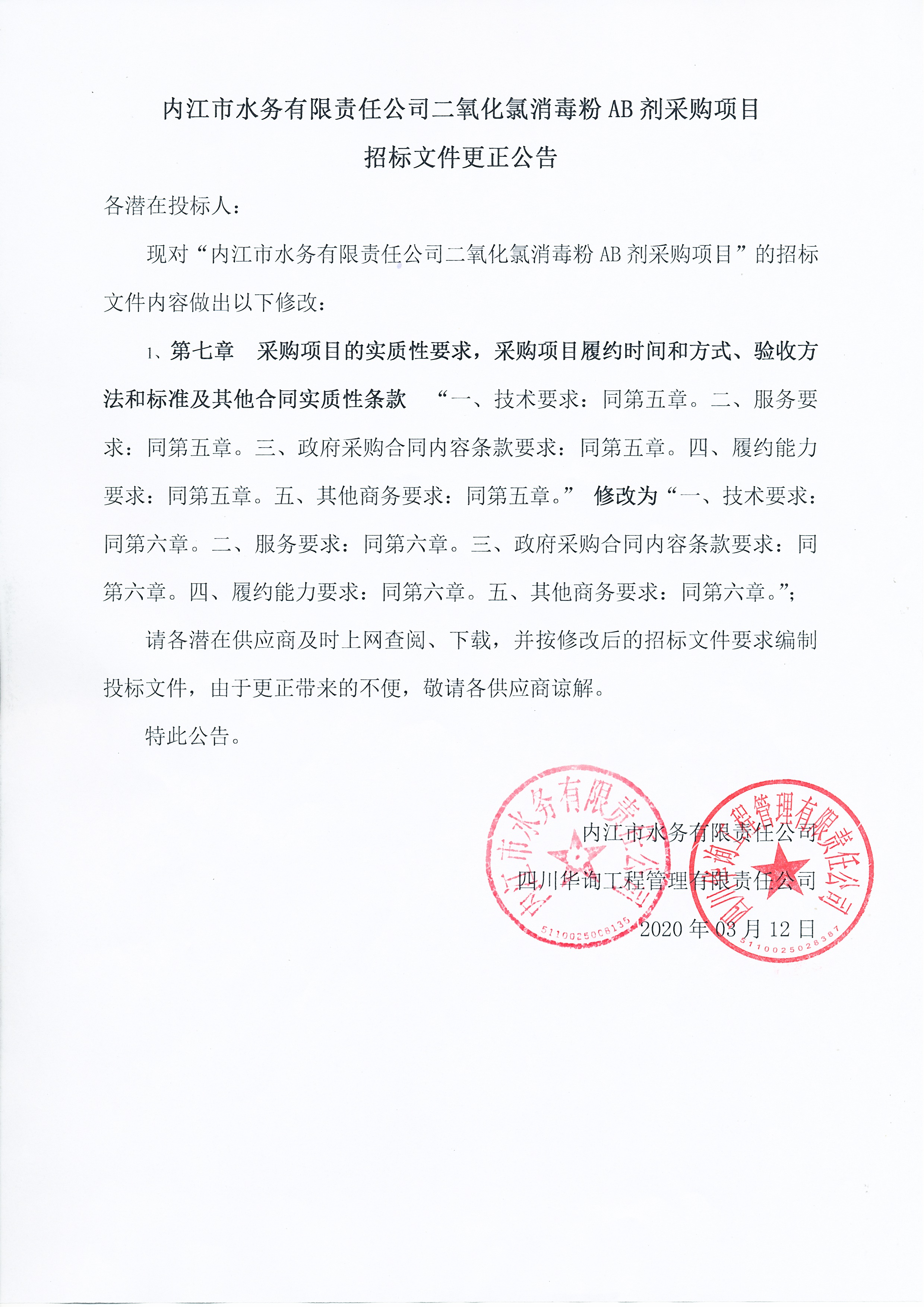 內(nèi)江市水務(wù)有限責(zé)任公司二氧化氯消毒粉AB劑采購項目招標(biāo)文件更正公告