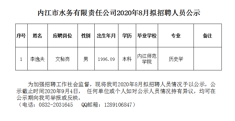 內江市水務有限責任公司2020年8月擬招聘人員公示