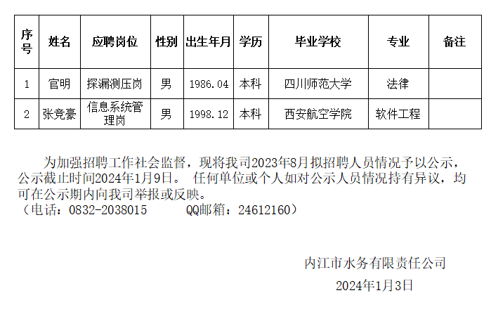 內江市水務有限責任公司2024年1月擬招聘人員公示