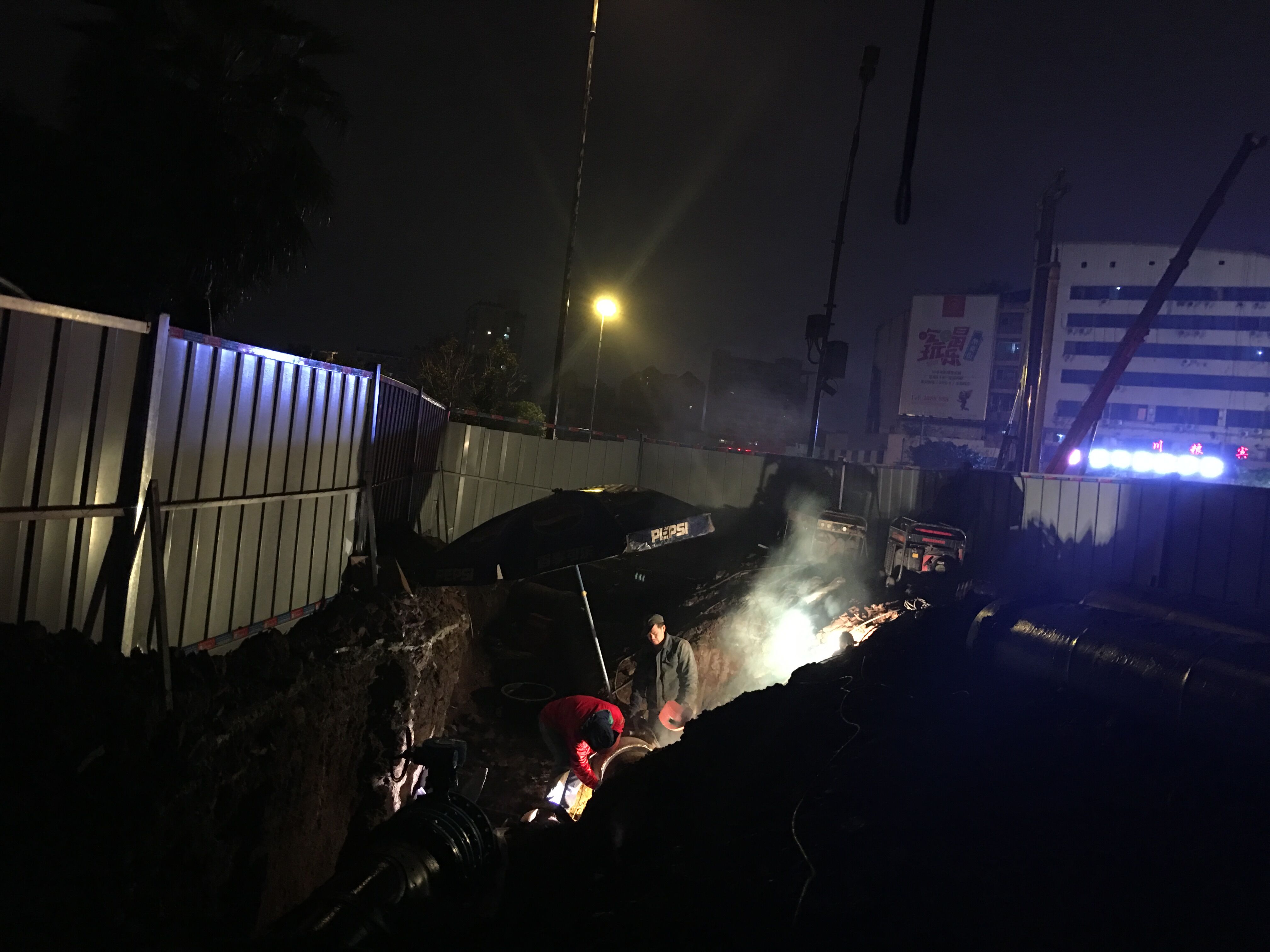 內(nèi)江市水務(wù)有限責(zé)任公司為配合西林大橋南北下穿工程順利進行,積極組織豪盛安裝公司、工程管理部、管網(wǎng)運行部等相關(guān)部門進行西林大橋南北橋頭下穿DN500給水管道改造。為保證附近居民白天的正常用水,我司特意把工期定在晚上和凌晨。2016年11月22日晚上11點多,陰雨綿綿,寒風(fēng)刺骨,公司黨委副書記、紀委書記、工會主席李濤帶領(lǐng)黨群工作部提上涼菜、面包和牛奶到施工現(xiàn)場慰問挑燈夜戰(zhàn)、頂風(fēng)作業(yè)的加班人員。他們不畏嚴寒、不知饑餓,只為不影響居民正常生活、保證城市安全供水埋頭苦干的水務(wù)人,讓我們不得不心生敬意。