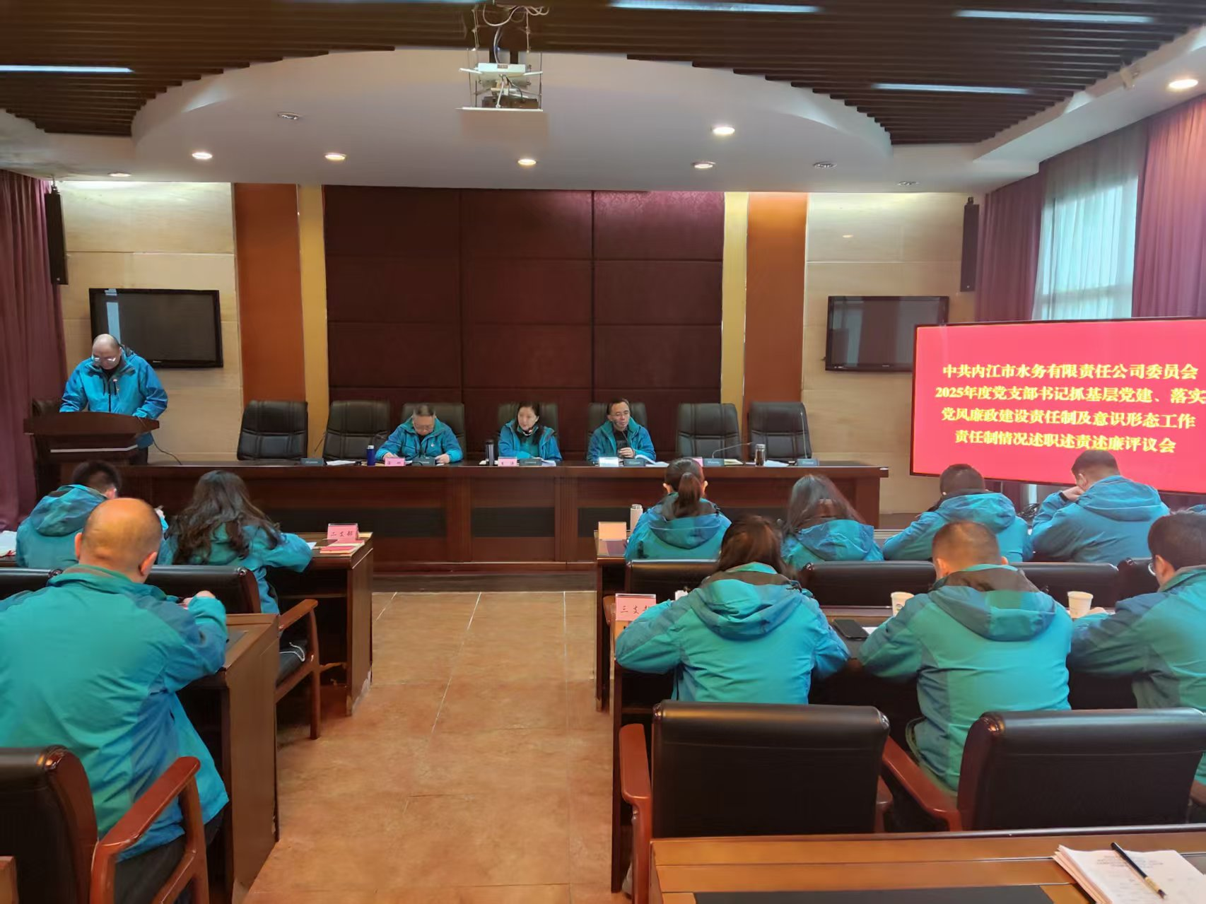 2026年1月28日,市水務公司黨委召開2025年度黨組織書記抓基層黨建工作暨黨風廉政建設述責述廉工作會。會議采取現場述職、書面述職及民主測評相結合的方式進行。一黨支部、污水處理公司黨支部、豪盛市政公司黨支部書記進行了現場述職,其他黨支部作書面述職。