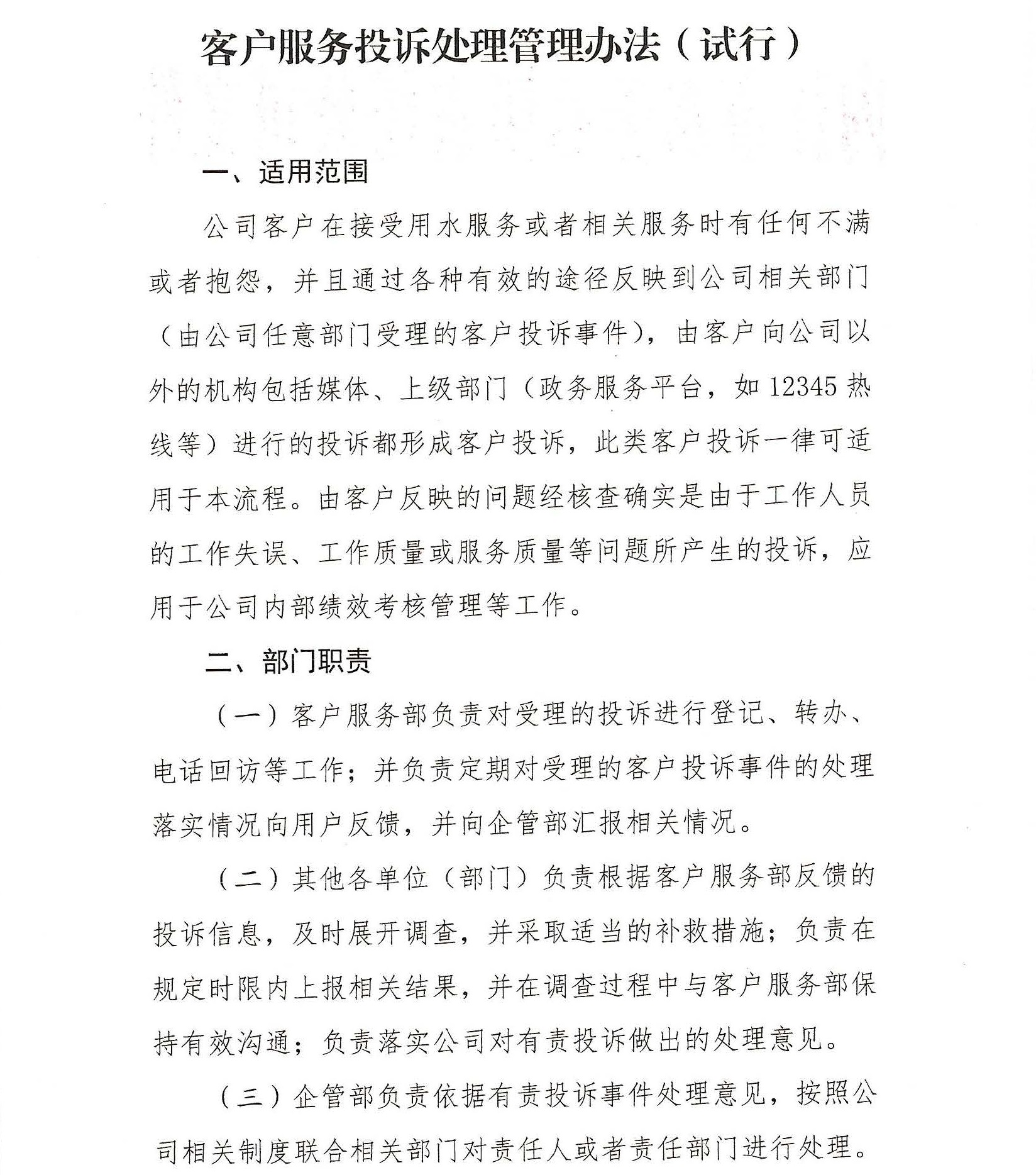 《客戶服務投訴處理管理辦法(試行)》