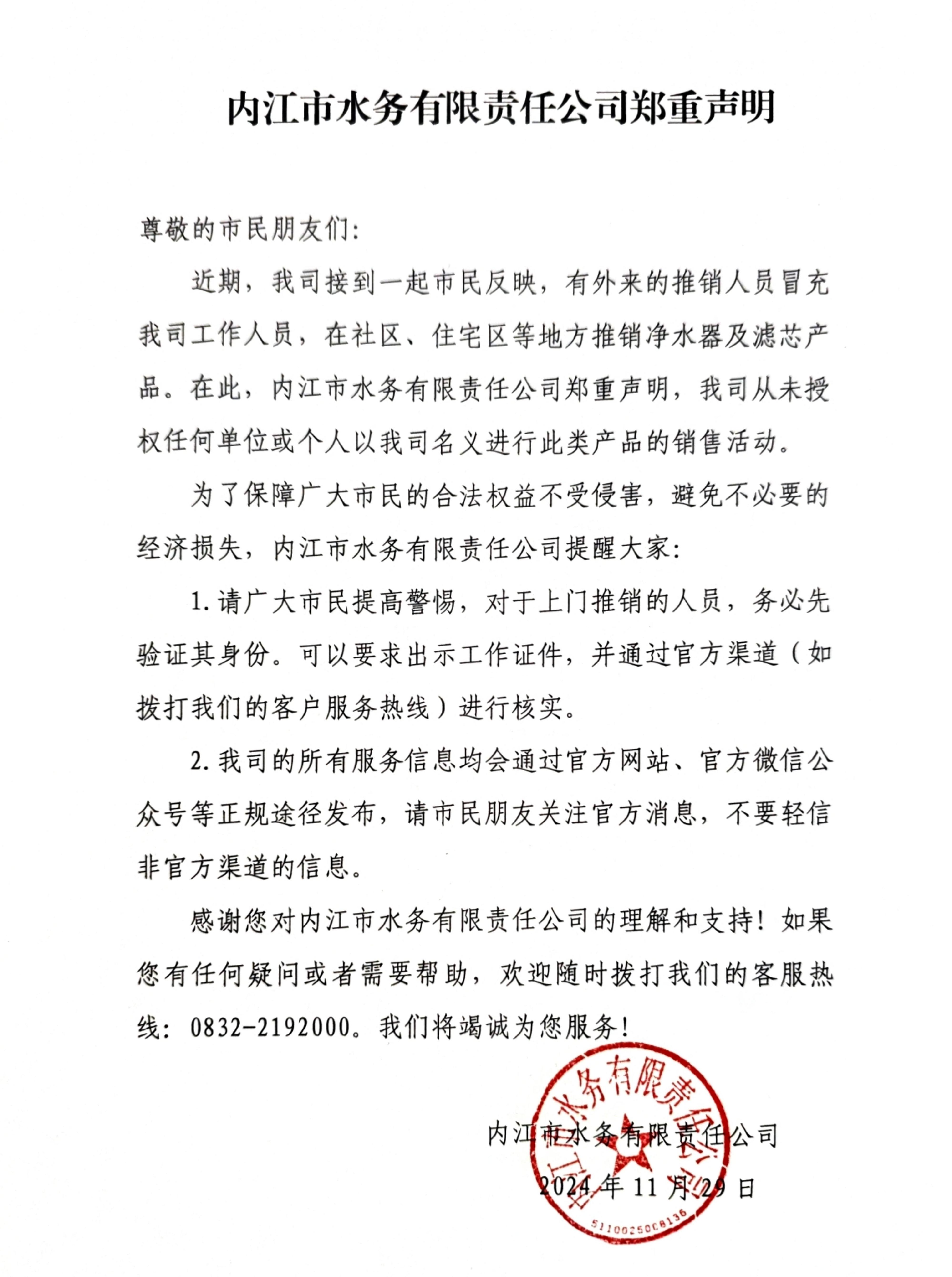 內(nèi)江市水務(wù)有限責(zé)任公司鄭重聲明