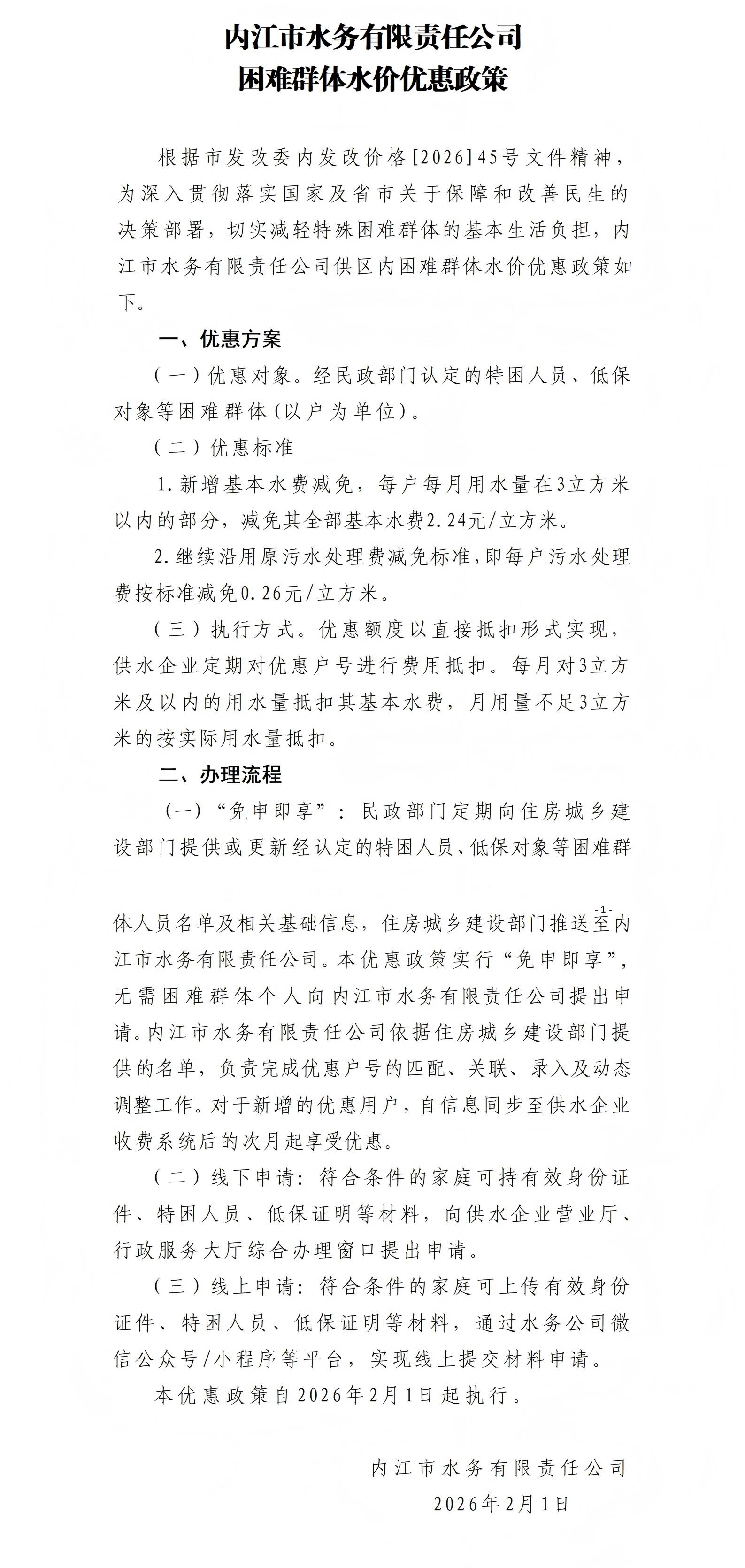 內江市水務有限責任公司困難群體水價優惠政策